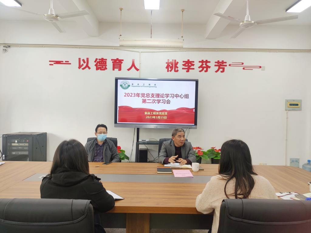 2023年3月15日下午,食品工程系党总支在系会议室召开2023年党总支理论学习中心组第二次学习(扩大)会议。会议由系党总支书记曾顺和主持,系副科级及以上干部、系党总支委员、支部委员和专业带头人参加会议。